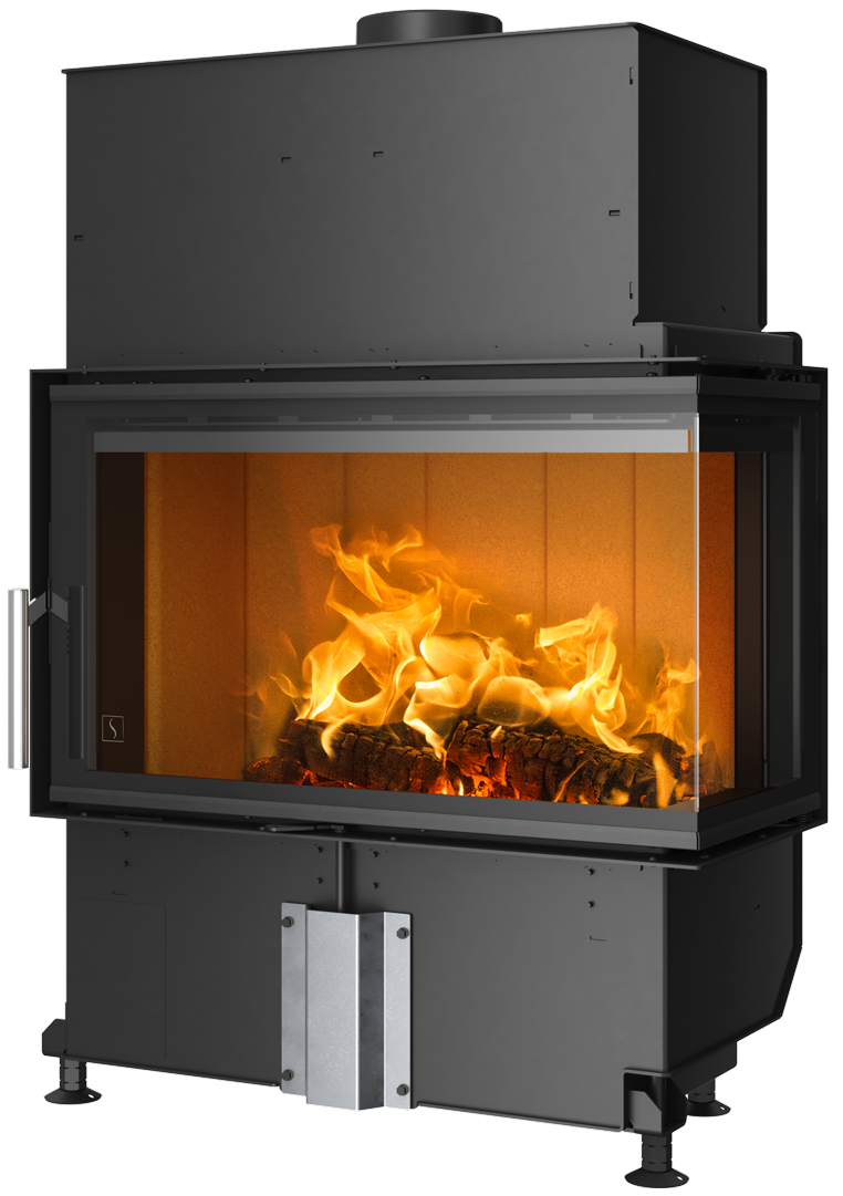Scan 5107 to wkład kominkowy o dyskretnym, ale wyrazistym designie, który pozwala cieszyć się widokiem płomieni przez dwustronne drzwiczki szklane, dając wrażenie siedzenia przy otwartym kominku. Dopływ powietrza reguluje się łatwo za pomocą jednej dźwigni, a elegancki uchwyt i czarna ramka wokół szyby dopełniają całości. Wybierz model z drzwiczkami otwieranymi na prawo lub na lewo, który można zainstalować na środku pomieszczenia lub idealnie w rogu. Możesz również zamontować dodatkowe kamienie akumulujące ciepło w obu wkładach. Są one ukryte w górnej komorze i zapewniają dodatkowe ciepło do 12 godzin po dołożeniu ostatniego kawałka drewna.